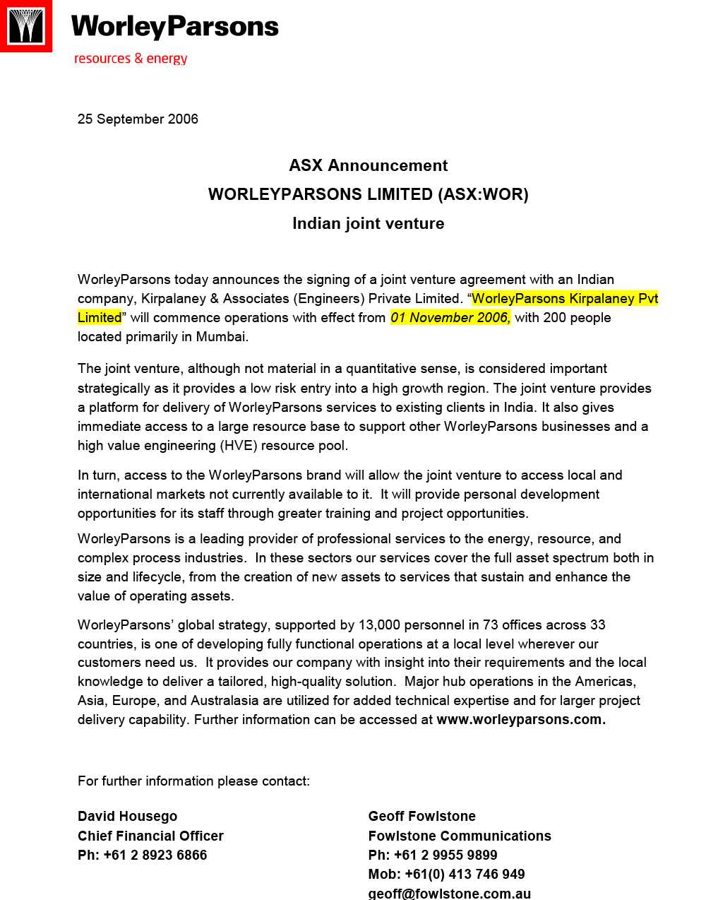 Kirpalaney & Associates (Engineers) Private Limited was instrumental in establishing WorleyParsons in India, now WORLEY, a JV agreement with Kirpalaney & Associates (Engineers) Private Limited. The JV as formed under the banner WorleyParsons Kirpalaney Engineering Private Limited was considered an important strategy as it provided WORLEY a low-risk entry into a high growth region. It provided a platform for delivery of WORLEY services to existing clients in India and also immediate access to a large resource base to support WORLEY’s businesses worldwide with a high value resource pool. The JV today is now 100% WORLEY completely integrated with the systems of WORLEY worldwide and has established in-house capability to service their projects with a recent purchase of JACOBS Engineering worldwide.